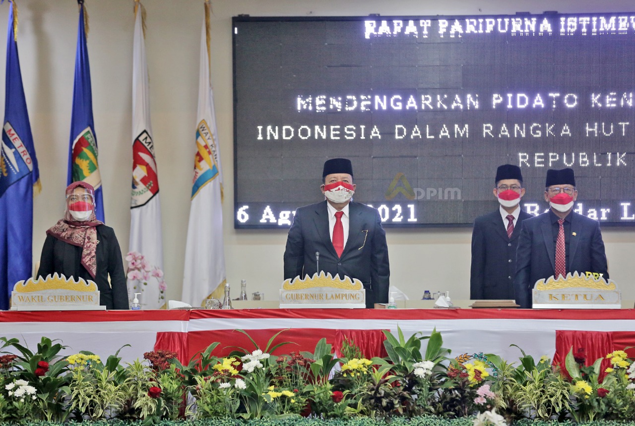 Rapat Paripurna Istimewa DPRD Provinsi Lampung dibuka oleh Ketua DPRD Provinsi Lampung Mingrum Gumay. Usai membuka rapat, menanti Pidato Kenegaraan Presiden Jokowi, Mingrum bersama seluruh peserta rapat mendengarkan lantunan lagu kebangsaan yang dibawakan Arjuna Entertainment Provinsi Lampung.