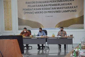 Kapolda Lampung Irjen Pol Hendri Sugiatno bersama unsur tiga pilar melaksanakan rapat koordinasi (Rakor), dengan agenda Evaluasi dan Pengendalian Koordinasi Antar Instansi/Lembaga Terkait Dalam Penanganan dan Pengendalian Covid-19 Berbasis Mikro. Kamis (17/6/2021) di Mahan Agung.